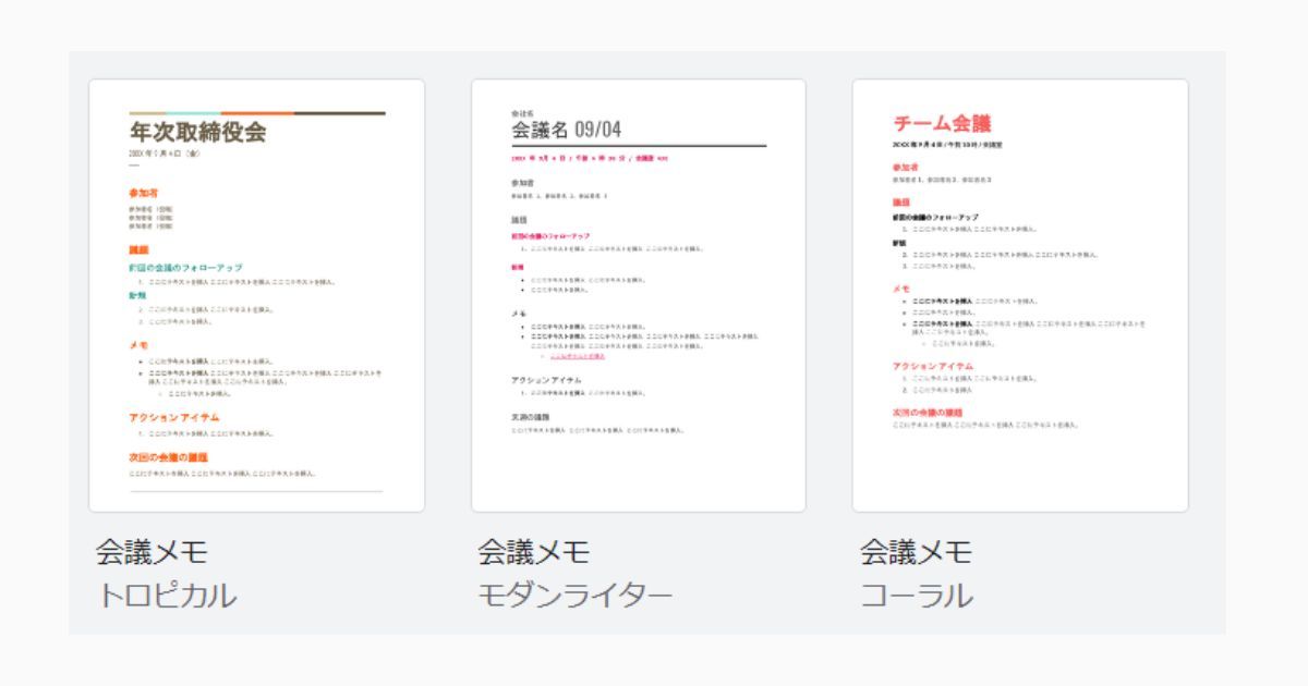 また、Googleドキュメントにもテンプレートは用意されています。こちらのテンプレートは見出し設定があらかじめされており、議事録としてそのまま使える完成度です。