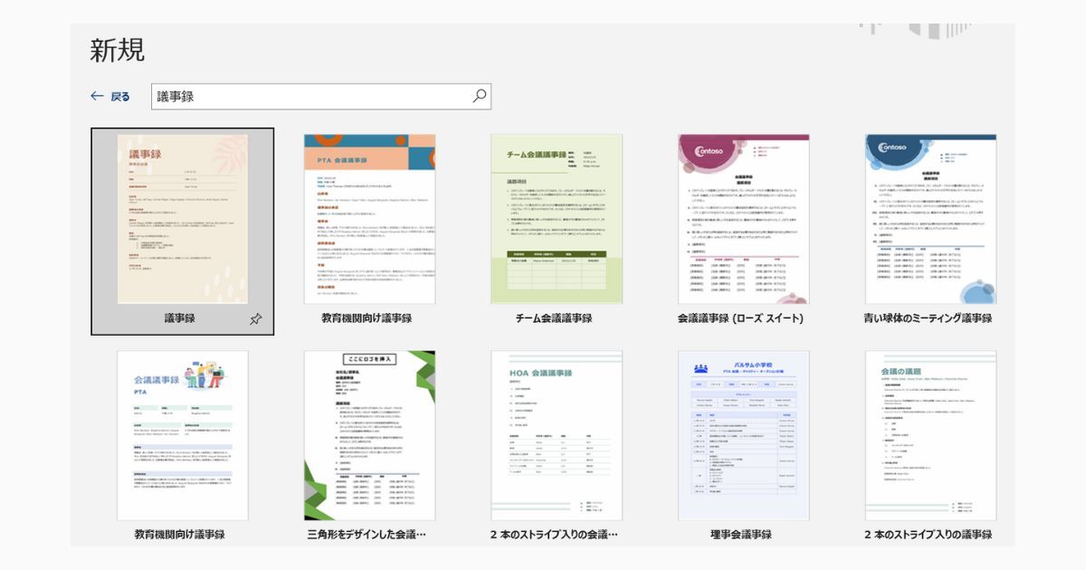 最初に紹介するのは、Microsoft 365のWordに搭載されているフォーマットです。Wordには、あらかじめ議事録のテンプレートが多数用意されています。