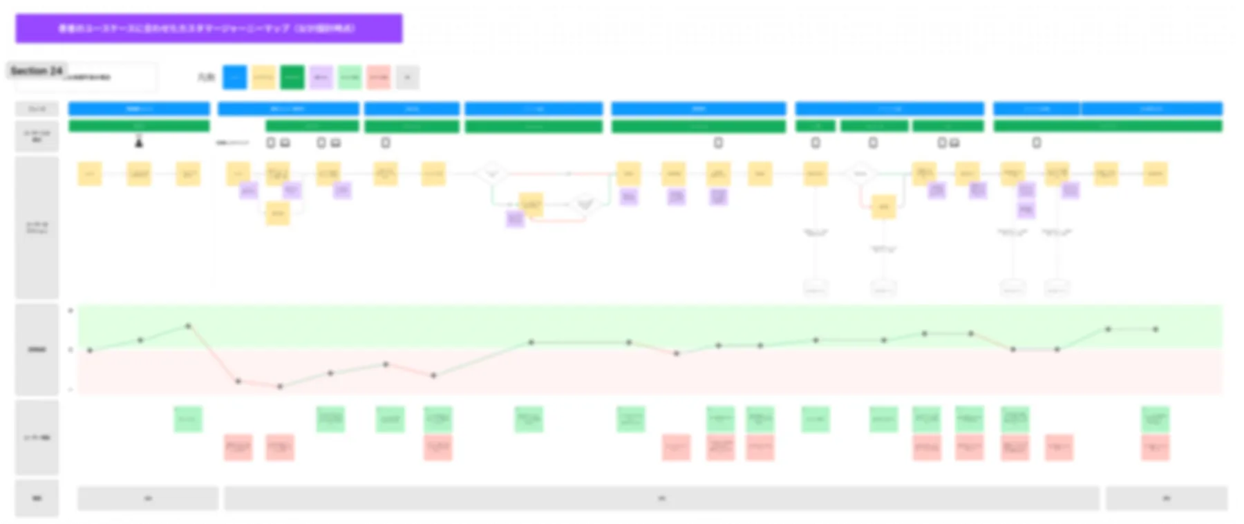 通常、CJMを作るときにはユーザーの感情なども一緒にプロットをしますが、これまで作った内容がなければ、具体的な感情を思い浮かべることができません。なのでここまでやってやっと感情を記載するようにします。