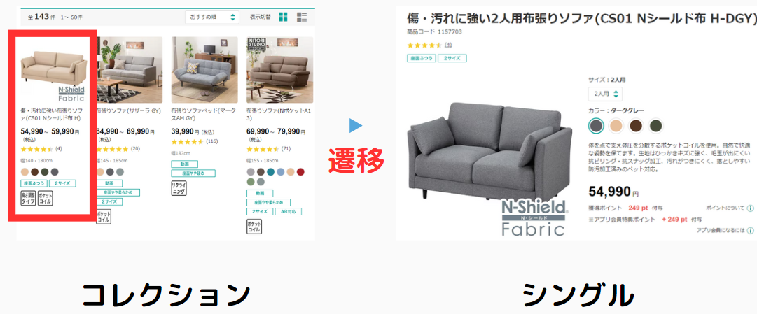 ソファーやカーテンのようにカテゴリーごとに商品一覧を表示する画面は「コレクション」、商品一つひとつの詳細情報を表示する画面は「シングル」と呼ばれます。