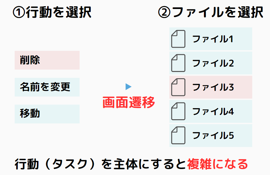 このことからわかるように、OOUIはオブジェクトを選んだあとにどのような行動をするのかを選択する流れで導線を組む考え方です。