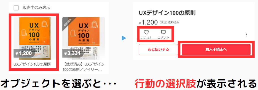 具体的な事例として、オンラインフリマサービスのメルカリが挙げられるでしょう。メルカリでは、興味がある商品をクリックすると、いいね!を付けたり出品者に連絡を取ったり、商品を購入したりできます。