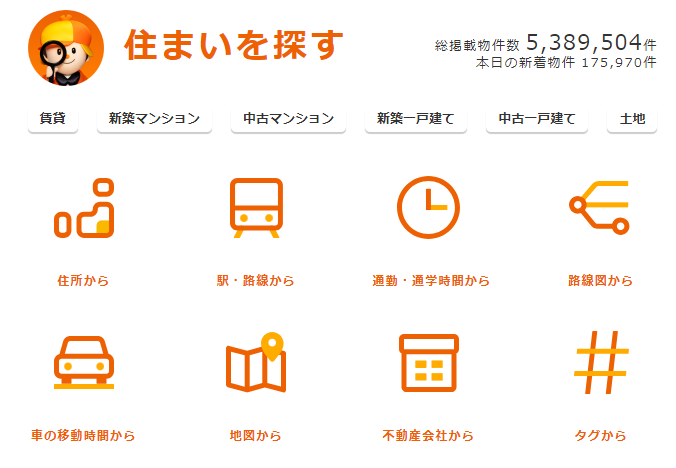 たとえば、不動産物件を探すサイトはタスク指向の構造になっている傾向があります。「住所から探す」「駅・路線から探す」などのタスクを選択してから、オブジェクトである物件にアプローチできる導線です。