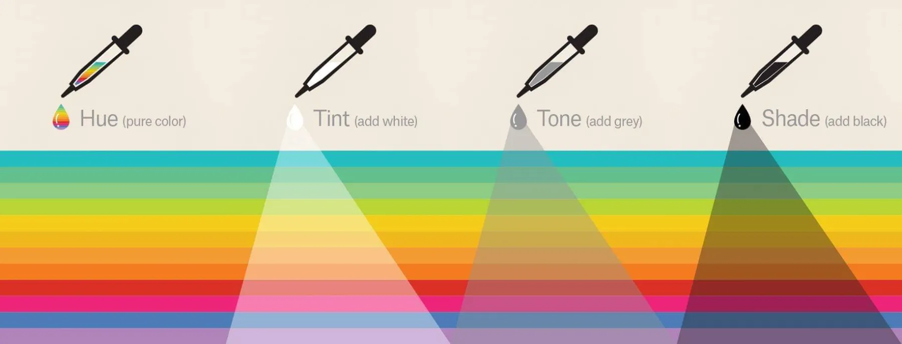 シェードは純粋な色に黒が追加された色合いで、例えば青+黒=暗い青になります。