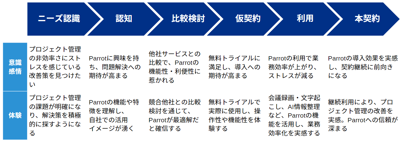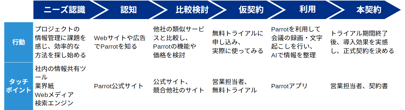時間軸概要ニーズ認識ミーティング動画データの扱いに不便さを感じる商品を認知自社商品(今回は「Parrot」)を知る比較検討他の企業のツールと性能や価格を比べる仮契約試用期間を活用して、ツールを使ってみる利用実際にツールを活用して使い心地を確かめる本契約・継続ツールがなくなると不便になるので、本契約で継続的に利用する