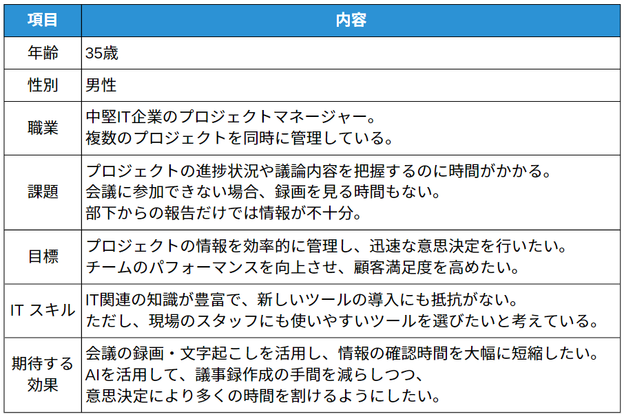 たとえば、ミーティングの録画情報からプロジェクトごとの進捗やアクションを自動で可視化するツール「Parrot」の場合、以下のようなペルソナが想定できます。