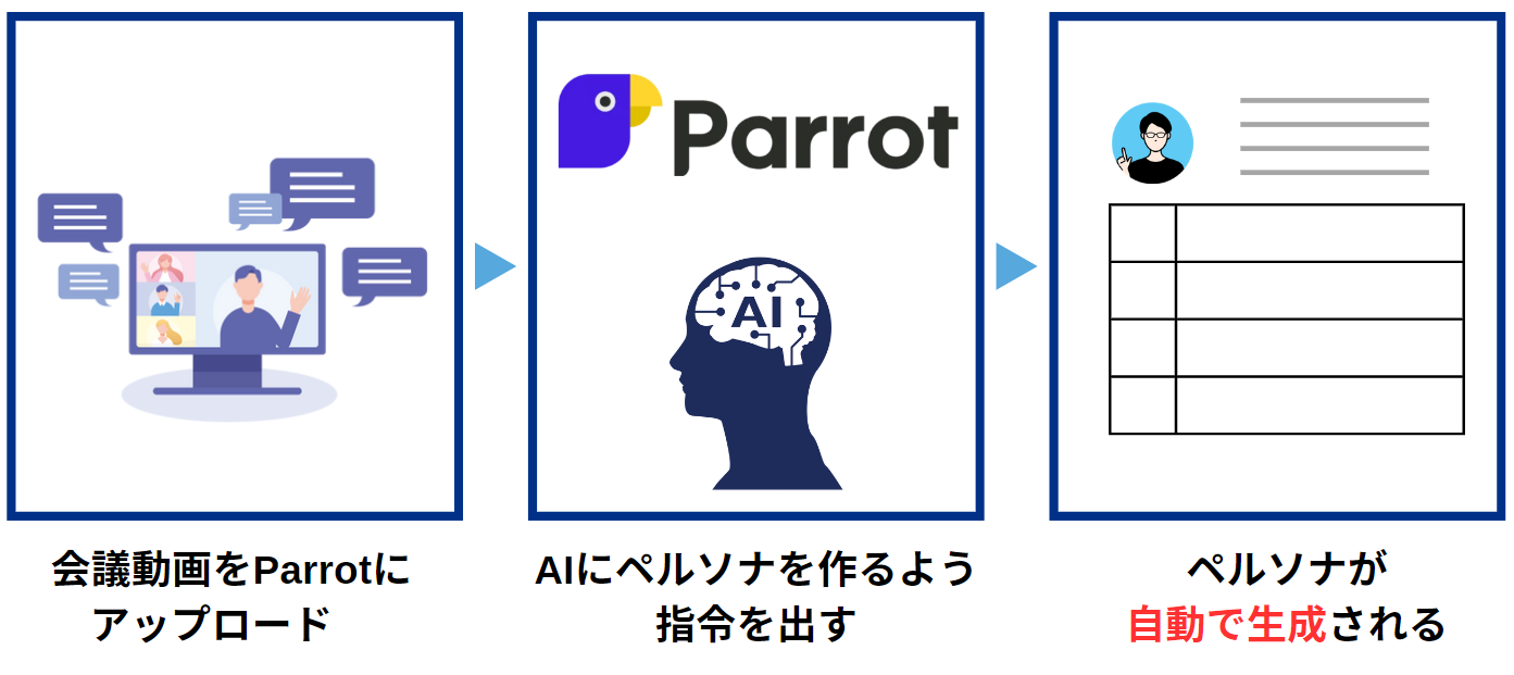 そこで業務効率化ツールのParrotを導入すれば、ペルソナ作成をスムーズに行えます。会議動画をアップロードし、AIチャットでペルソナを作成するよう指令を出すと、会議の内容に基づいたペルソナを自動生成できるからです。