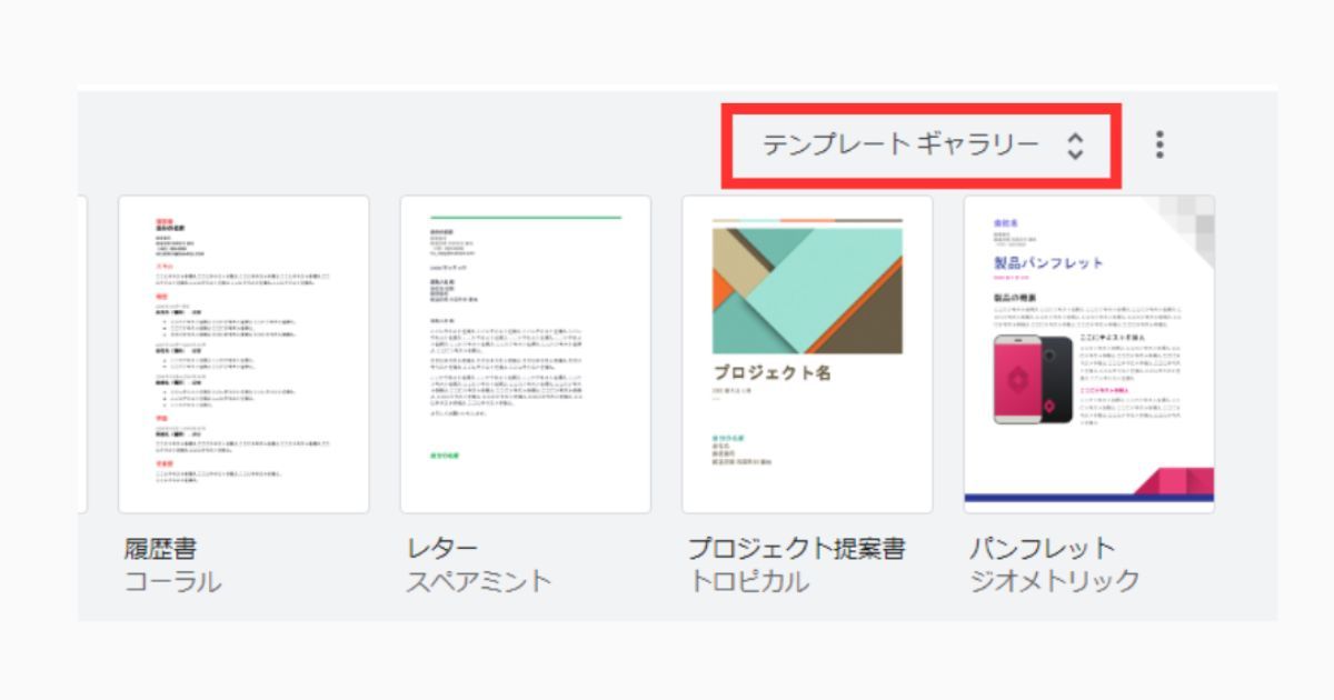 Googleドキュメントを開き「テンプレートギャラリー」をクリックすると、議事録を含むさまざまなテンプレートが表示されます。