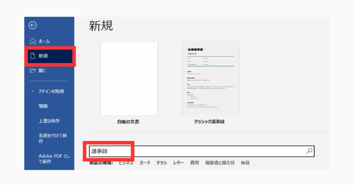 アクセス方法は簡単で、Wordを開き「新規」をクリック。次に検索窓に「議事録」と入力して検索すれば、議事録テンプレートの一覧が表示されます。