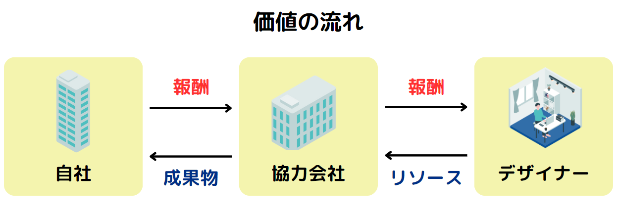 マップに書き込むべき価値の流れは、資金的な視点にとどまらず、成果物や人的リソースなども挙げられます。