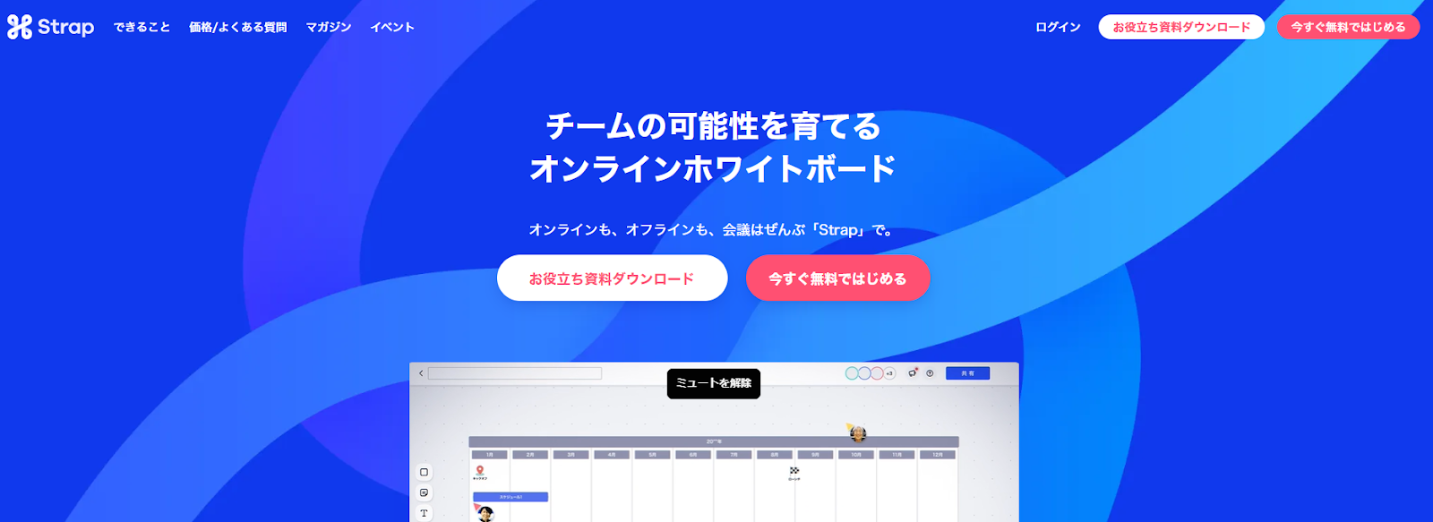 Strapは、国内No.1のシェアを持つ日本製オンラインホワイトボードツール。UIデザインに優れ、直感的な操作性が高く、セキュリティレベルが高いのが特徴です。