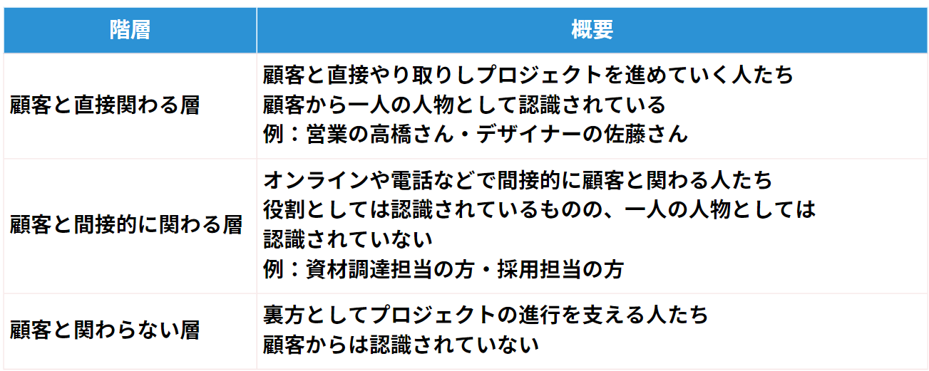 顧客を中心としたステークホルダーマップを作成する場合、中心から外に向けて3階層に分けられます。
