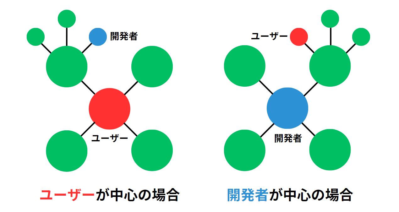 なお、中心に据える主人公によってステークホルダーマップの切り口は変わります。たとえば、サービスの利用者と開発者のうちどちらをマップの中心に据えるのかによって、ステークホルダーマップの見え方は異なります。